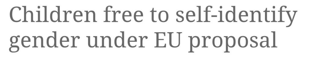 I ett dokument som publicerades den 8 oktober uppger EU-kommissionen att den kommer att ”stödja utvecklingen av rättsliga förfaranden för könserkännande baserade på självbestämmande som är fria från åldersbegränsningar”.