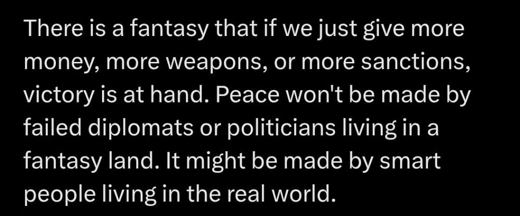 ”Det finns en fantasi att om vi bara ger mer pengar, fler vapen eller fler sanktioner, så är segern nära. Fred kommer inte att skapas av misslyckade diplomater eller politiker som lever i ett fantasiland. Den kan skapas av smarta människor som lever i den verkliga världen.”