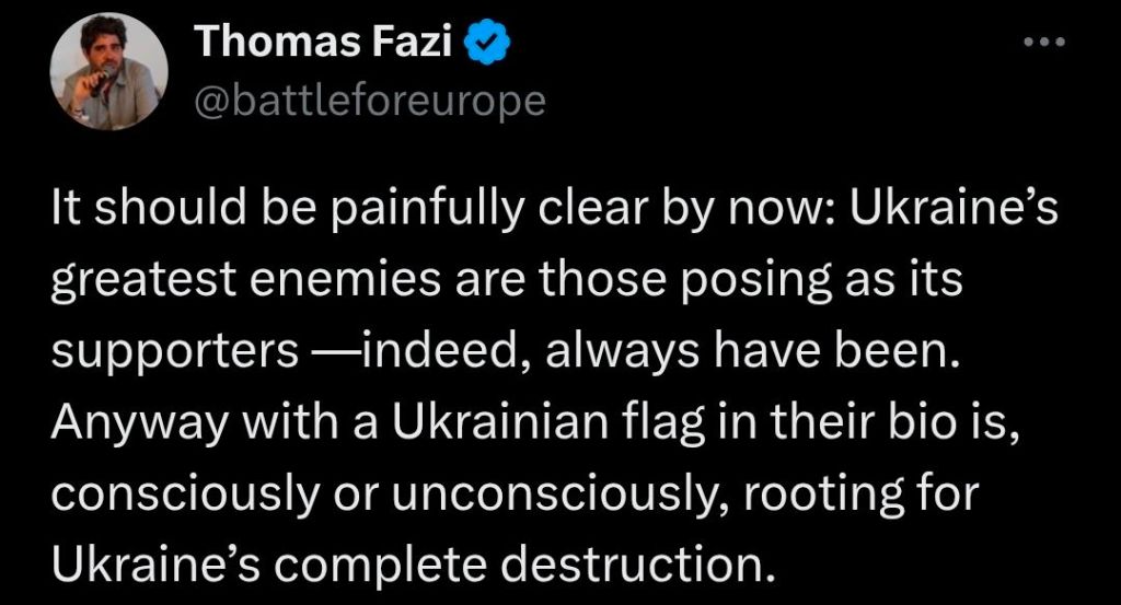 Den italienska journalisten Thomas Fazi sammanfattar det ”europeiska tillståndet” på ett bra sätt i ett inlägg på X där han konstaterar att det ukrainska folkets främsta motståndare är de som låtsas vara deras allierade.