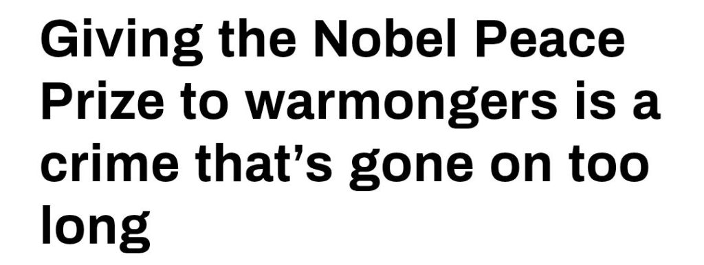 Samtidigt har Machado och den amerikanska regeringen utnyttjat fredsprisets rykte för att ge dem en casus moralis – ett moraliskt argument för krig mot den sydamerikanska nationen och avsättningen av Venezuelas president Nicolás Maduro, den tidigare busschauffören och fackföreningsledaren som blivit nationalhjälte. Efter ett USA-lett regimskifte som vi har sett utspela sig i andra länder runt om i världen, skulle Machado installeras med våld och detta skulle ge USA fritt spelrum över Venezuelas enorma rikedomar i naturresurser, inklusive världens största oljereserver.
