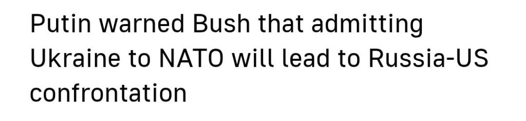 Nu vill jag upprepa vad jag sa till Condi och Gates [dåvarande amerikanska utrikesministern Condoleezza Rice och försvarsminister Robert Gates] i Moskva om Natos utvidgning. Det är inget nytt för er och jag förväntar mig inget svar; jag vill bara säga det högt. Jag vill betona att en anslutning till Nato för ett land som Ukraina kommer att skapa ett långsiktigt konfliktfält för er och oss, en långsiktig konfrontation eftersom det skulle skapa ett hot om att Nato flyttar sina militärbaser och olika vapensystem till exakt samma område som den ryska gränsen. Alla ukrainare är inte glada över sitt lands potentiella medlemskap i Nato och en tredjedel av Ukrainas befolkning, eller 17 miljoner människor, är ryssar.”