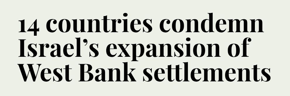 ”Vi, staterna Belgien, Kanada, Danmark, Frankrike, Tyskland, Italien, Island, Irland, Japan, Malta, Nederländerna, Norge, Spanien och Storbritannien fördömer det israeliska säkerhetskabinettets godkännande av 19 nya bosättningar på den ockuperade Västbanken. Vi erinrar om vårt tydliga motstånd mot alla former av annektering och mot en utvidgning av bosättningspolitiken. Sådana ensidiga handlingar bryter mot internationell rätt och riskerar att undergräva en bräcklig vapenvila i Gaza.”