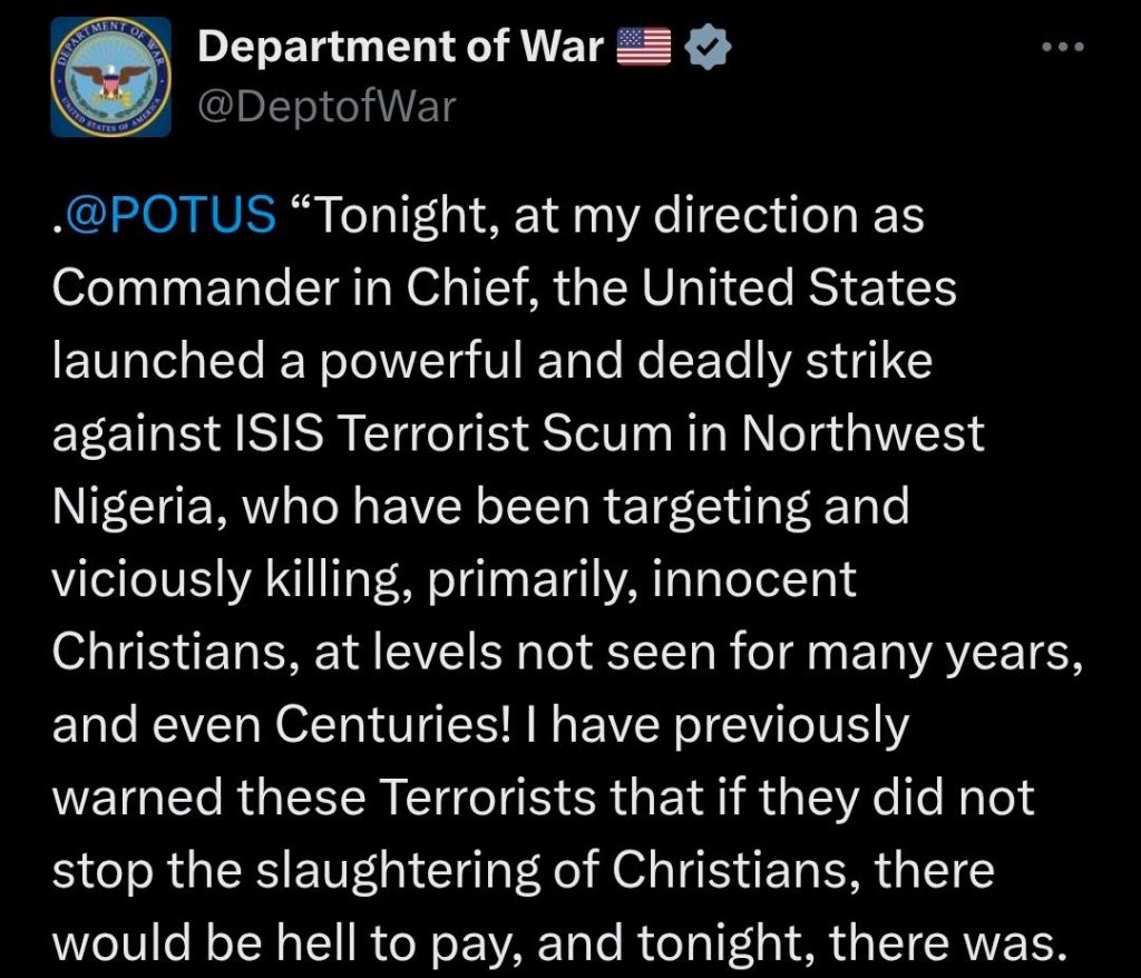 I ett uttalande på Truth Social sade Trump att den dödliga attacken var riktad mot ISIS-terroristavskum i nordvästra Nigeria, som har riktat in sig på och brutalt dödat främst oskyldiga kristna, på nivåer som inte setts på många år eller till och med århundraden.