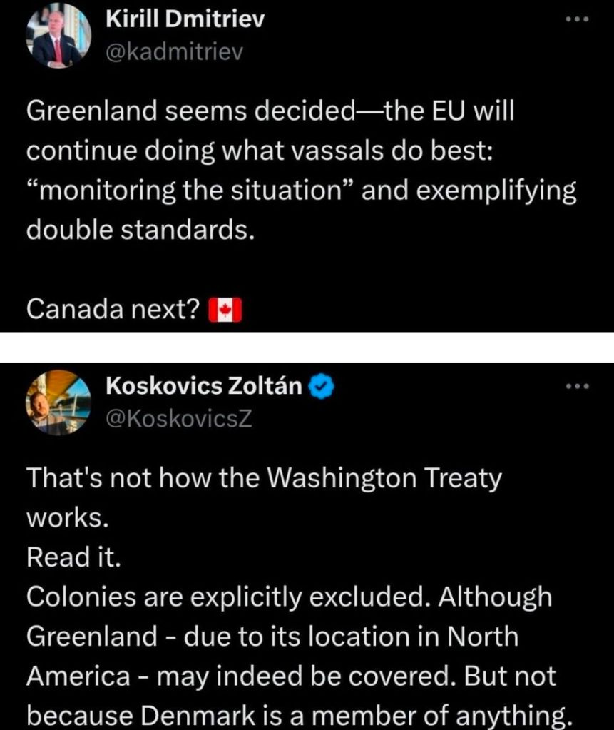 ”När det gäller Grönland verkar ett beslut ha fattats – EU kommer att fortsätta göra det vasaller gör bäst: ‘övervaka situationen’ och visa dubbelmoral. Är Kanada nästa?”