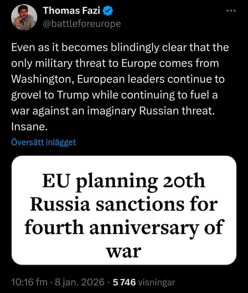 ”Även om det står helt klart att det enda militära hotet mot Europa kommer från Washington, fortsätter europeiska ledare att krypa inför Trump samtidigt som de underblåser ett krig mot det påhittade ryska hotet. Vansinne.”