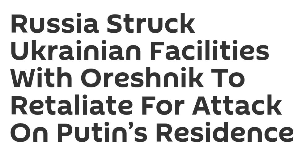 Rysslands försvarsministerium uppger att man använde det avancerade hypersoniska ballistiska missilsystem Oreshnik i den senaste attacken i natt mot drönarproduktionsanläggningar, energiinfrastruktur och andra militärrelaterade anläggningar i Ukraina, vilket var ett svar på attacken mot den ryske presidenten Vladimir Putins residens i Novgorodregionen strax innan nyår. Enligt ministeriet uppnåddes alla mål med attacken.