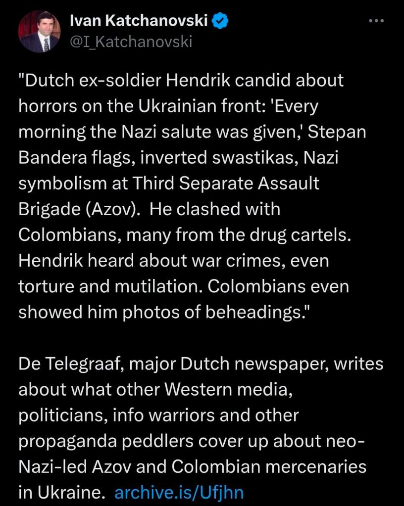 Den holländske före detta soldaten Hendrik är öppenhjärtig om fasorna på den ukrainska fronten och beskriver att det varje morgon gavs nazisthälsning, Stepan Banderas flaggor vajade och det fanns inverterade hakkors samt annan nazistisk symbolik vid den tredje separata anfallsbrigaden Azov. Han berättar även om hur han drabbade samman med colombianer, många från drogkartellerna och hörde talas om krigsförbrytelser, till och med tortyr samt stympning där colombianer visade honom bilder på halshuggningar.
