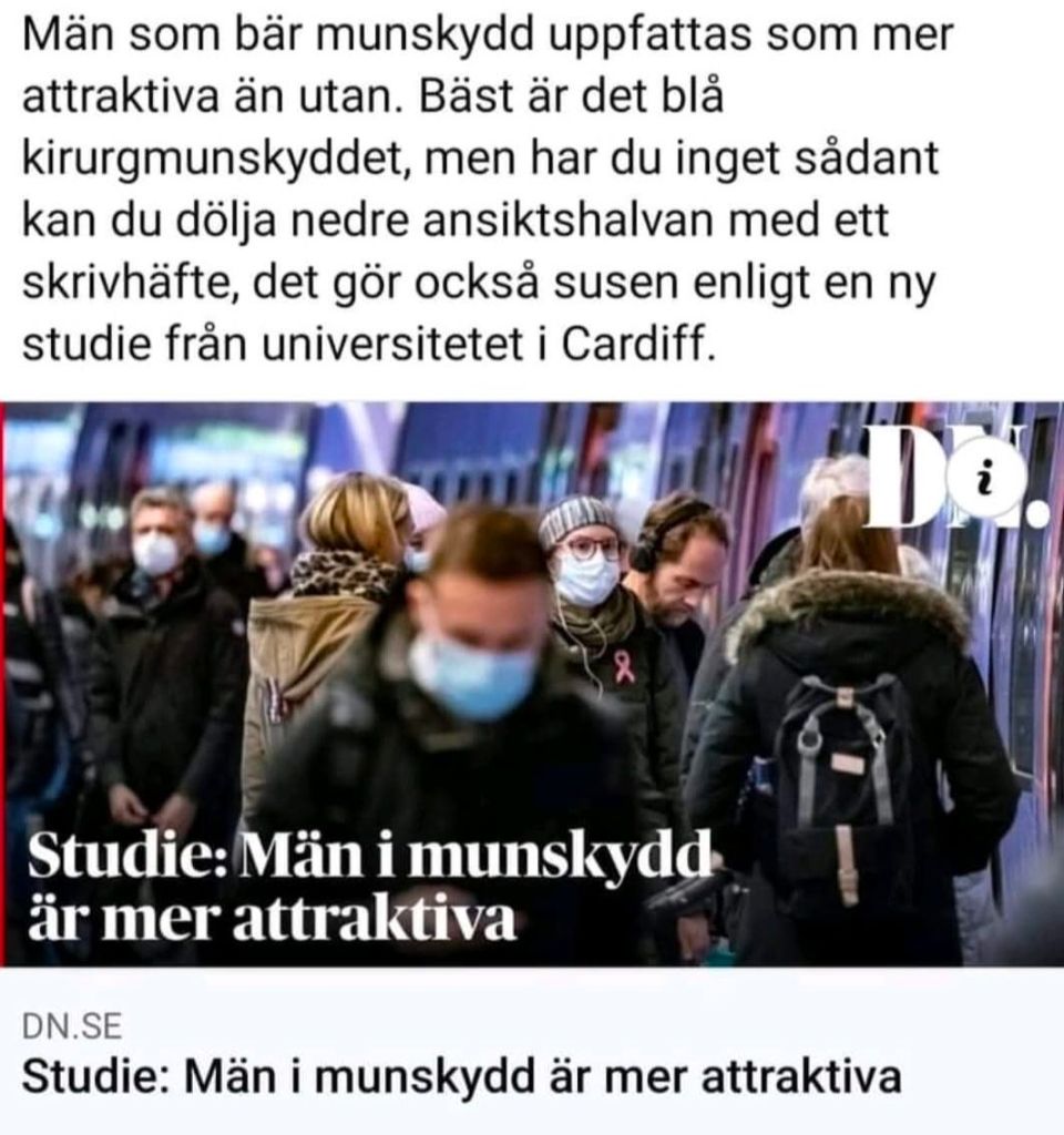Den här bilden kom upp som ett minne på Facebook som jag publicerade den 19 januari 2022 – bara för att påminna oss om hur sjukt indoktrinerade befolkningen var och tyvärr fortfarande är med hjälp av massmedia, där denna uppmuntran för att få folk att bära munskydd bara var ett i mängden. 🤦♀️😄
