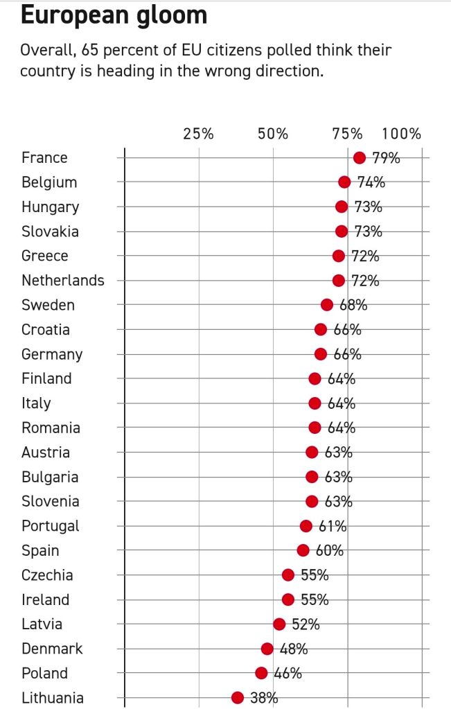 Majoriteten av de tillfrågade i nästan alla länder anser att deras land är på fel spår – undantagen är Polen, Litauen och Danmark.