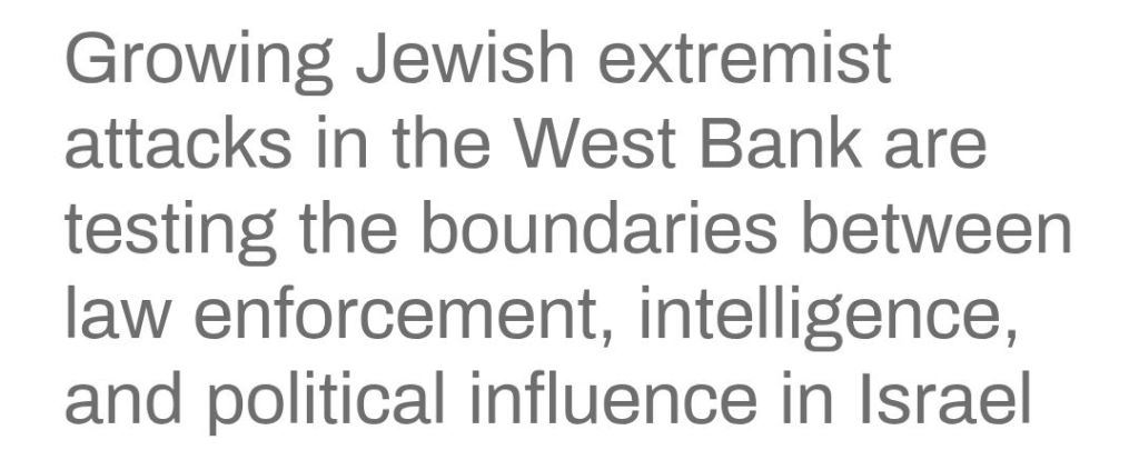 År 2024 publicerade Arik Barbing, en före detta Shin Bet-officer, en artikel där han argumenterade för att judiska extremistgrupper blomstrar eftersom de åtnjuter implicit politiskt stöd – särskilt från Israels nationella säkerhetsminister, Itamar Ben Gvir, som själv har en lång historia inom Shin Bet efter att ha arresterats och förhörts flera gånger tidigare för extremistisk verksamhet på Västbanken.