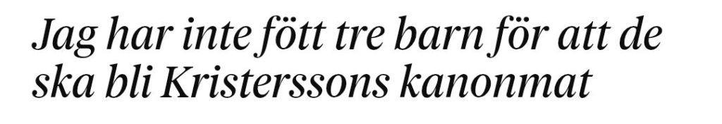 Jag håller med artikelförfattaren till fullo; jag har inte fött fyra barn för att de ska bli Ulf Kristerssons kanonmat – med det tillägget att det här inte är ett isolerat problem inom Tidöregeringen med sitt stödparti Sverigedemokraterna, utan vi får mer av samma vara oavsett vilka riksdagspartier som styr Sverige då samtliga sitter fast i samma koppel som är i symbios med det militärindustriella komplexet.