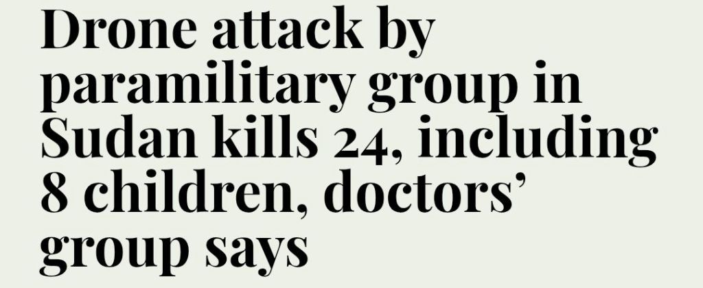 Paramilitära RSF som anklagas för återkommande massakrar och etnisk rensning i Sudan slog till igen i går med en drönarattack där ett fordon som transporterade civila i centrala Sudan träffades och dödade minst 24 personer, inklusive åtta barn och lämnade många skadade.