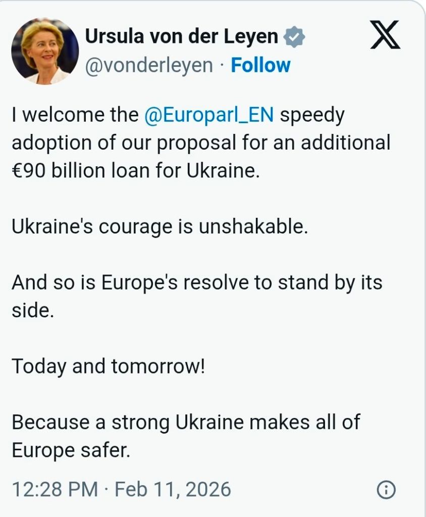 Se där ja, EU-parlamentet släppte som förväntat igenom ”lånet” till Ukraina på 90 miljarder euro och plattityderna står som spön i backen när EU-kommissionens ordförande Ursula von der Leyen skriver på X.