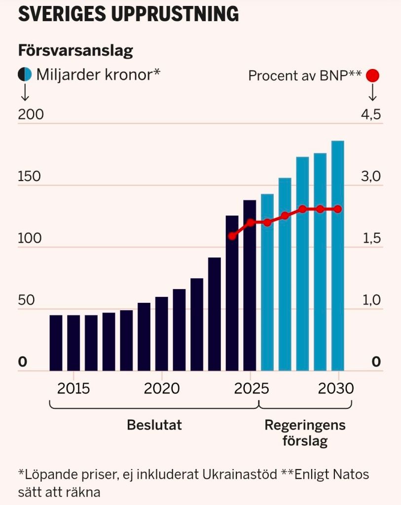Där är vi nu och som vår finansminister deklarerade i dag är det helt i sin ordning att göra avsteg från det ekonomiska ramverket för att genomföra försvarsupprustningen eftersom det är en ”existentiell fråga”. Att kommande generationer får betala rejält för våra beslutsfattares krigshybris – som spänner från höger till vänster – samt att svenska skattemedel används för att profitera på krig och döda människor är så klart inget att haka upp sig på.