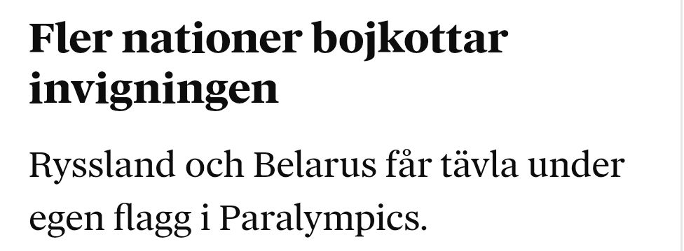 Det var patetiskt redan för fyra år sedan när Ryssland på grund av sin operation i Ukraina isolerades från alla idrotts- och kulturevenemang – till och med uteslöts från Eurovision – för att inte tala om den ökända bojkotten av företaget Mondelez där bland annat Marabou ingår, medan andra krigförande länder som till exempel Israel hade carte blanche. Och det blir om möjligt ännu mer hyckleri nu när flera länder (föga förvånande är majoriteten EU-länder) valt att bojkotta invigningen av Paralympics på fredag bara för att Ryssland och Belarus tillåts att tävla under egen flagg, men ingen har några som helst problem med att USA och Israel som är i full gång att bomba Iran deltager.