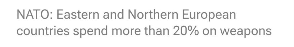 Länder som Polen, Rumänien, Finland, Litauen, Lettland och Ungern spenderar betydligt mer på vapen än Natogenomsnittet på 20%. Polen ligger i topp med vapenutgifter på nästan 51%, följt av Ungern 48,19%, Litauen 45,67%, Finland ca 44% samt Lettland och Sverige 36%.