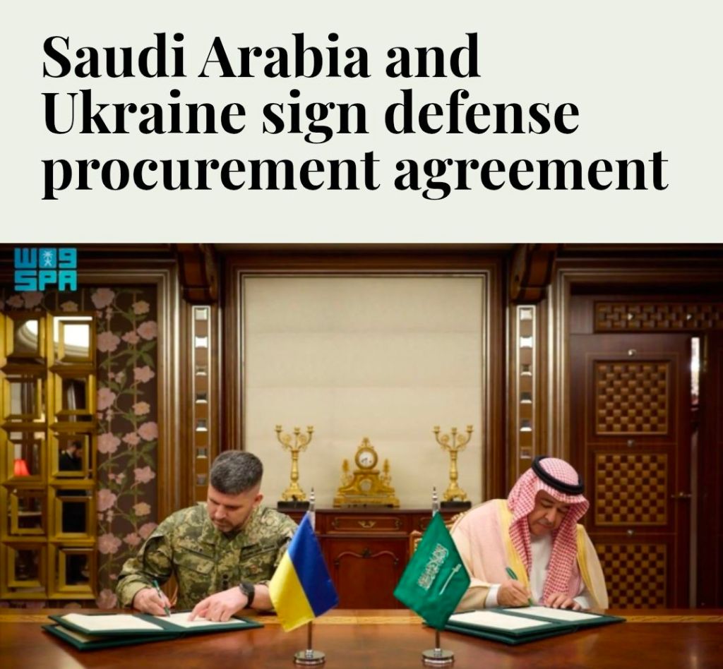 Den ukrainske ledaren och globetrottern Zelenskyj besökte i torsdags det saudiska kungadömet på en överraskningsvisit och frotterade sig med landets kronprins Mohammed Bin Salman som ledde fram till att Khalid Al-Bayari, Saudiarabiens biträdande försvarsminister för exekutiva frågor, samt generallöjtnant Andriy Hinatov, chef för generalstaben för Ukrainas väpnade styrkor, i går undertecknade ett samförståndsavtal i Jeddah inklusive arrangemang för försvarsupphandling.