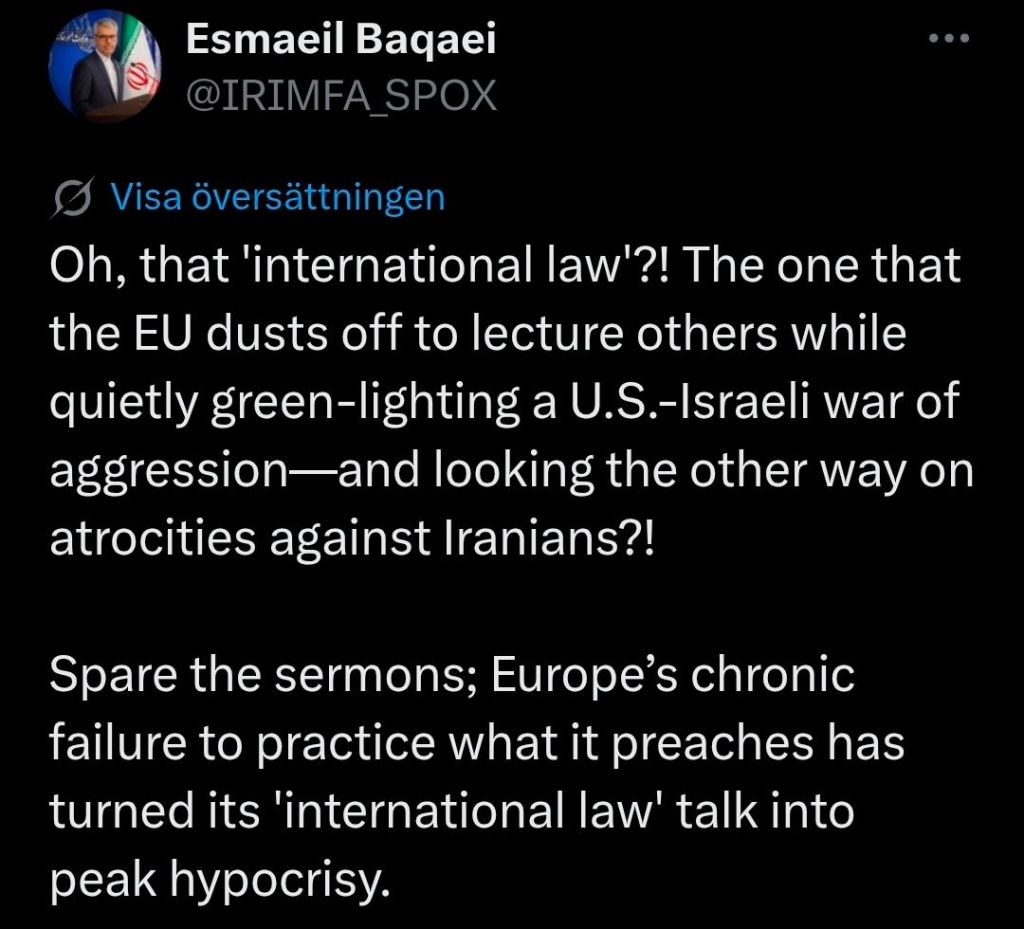 ”Åh, den där ‘internationella rätten’?! Den som EU dammar av för att läxa upp andra samtidigt som de i tysthet ger grönt ljus till ett amerikansk-israeliskt anfallskrig – och ser bort från grymheter mot iranier?!