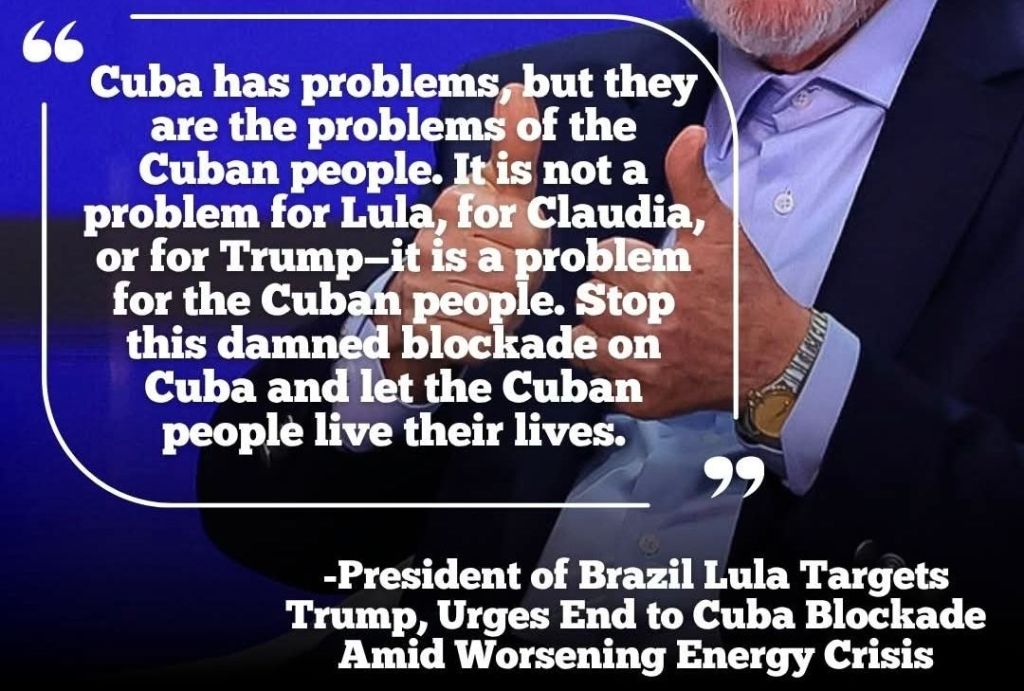 -”Kuba har problem, men det är det kubanska folkets problem. Det är inte ett problem för Lula, Claudia eller Trump; det är ett problem för det kubanska folket. Avsluta den här förbannade blockaden mot Kuba och låt det kubanska folket leva sina liv! Vi kan inte förbli tysta.”